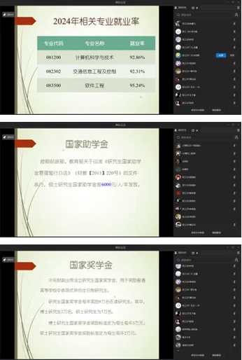 的考研趋势,并讲解了各类奖学金助学金情况。她特别提到,随着考研人数的逐年增加,竞争愈加激烈,报考时应综合各方面实力,理性选择学校。