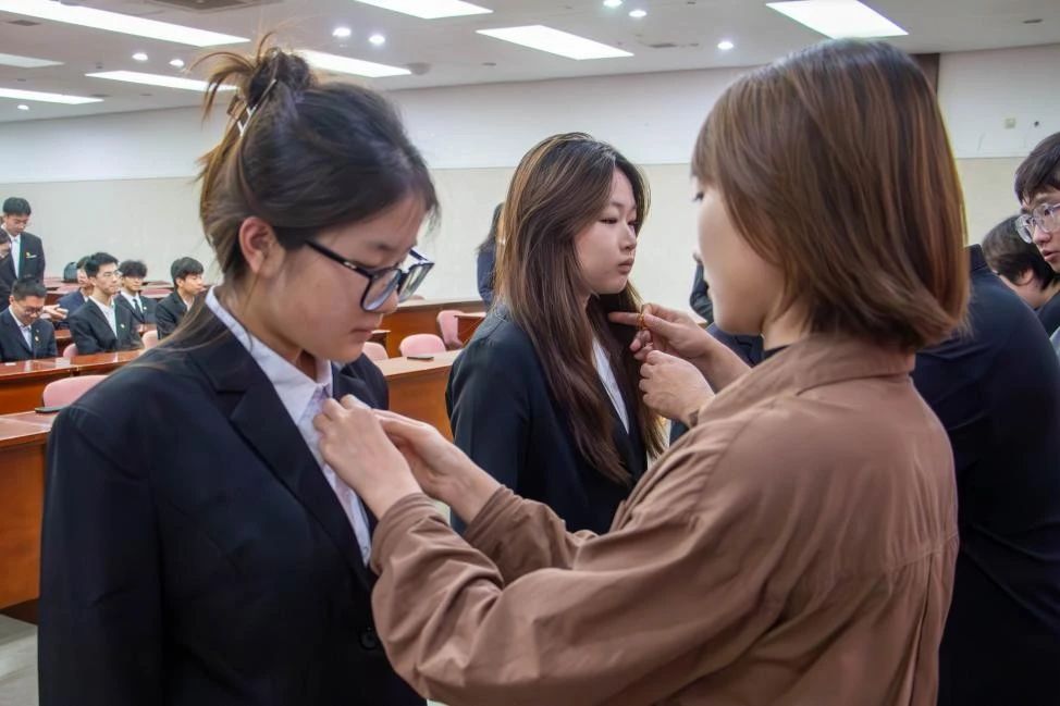 仪式在国歌声中拉开帷幕。李欣璐宣读了新团员名单。出席的领导、老师和优秀团员代表为新团员们佩戴了团徽。