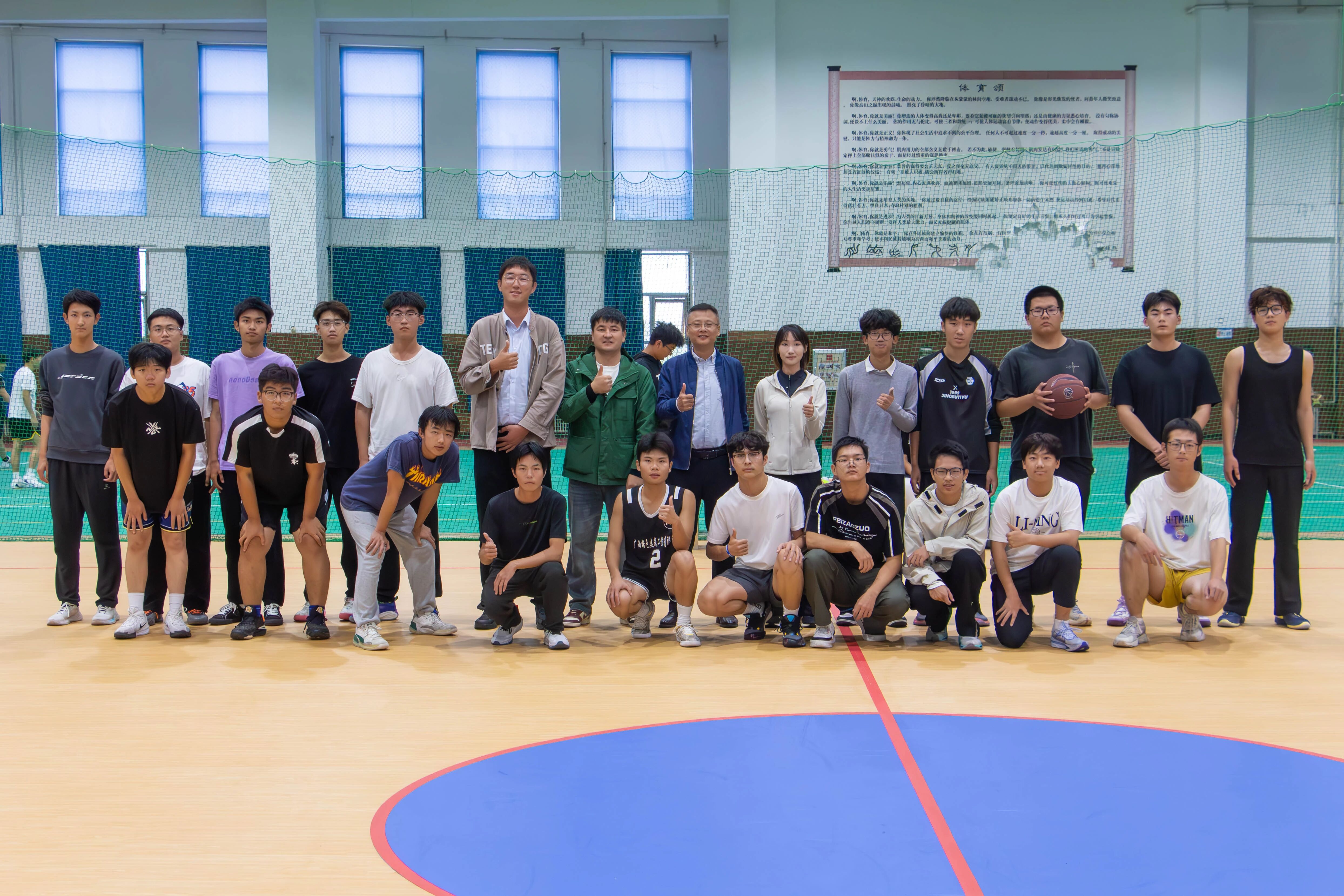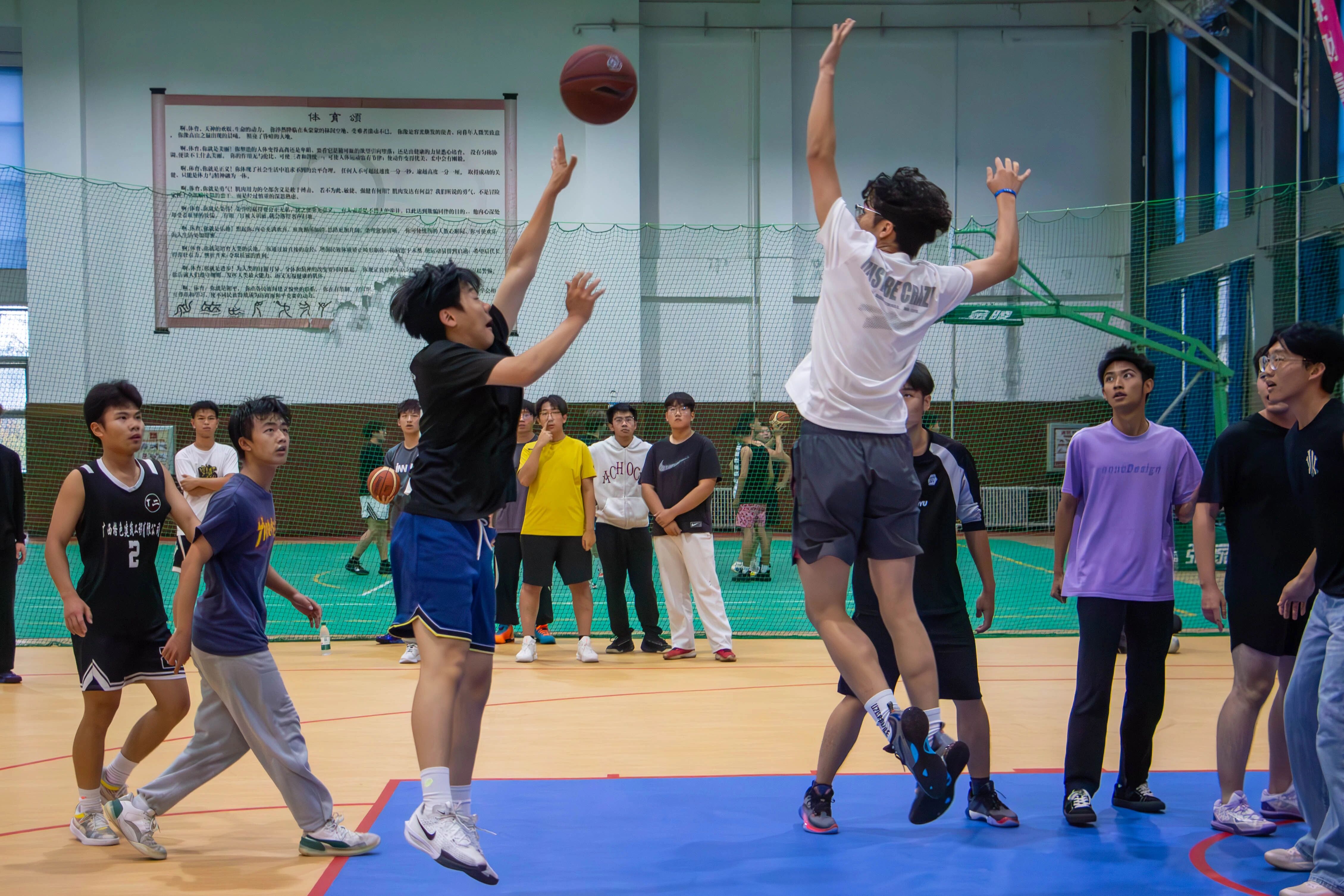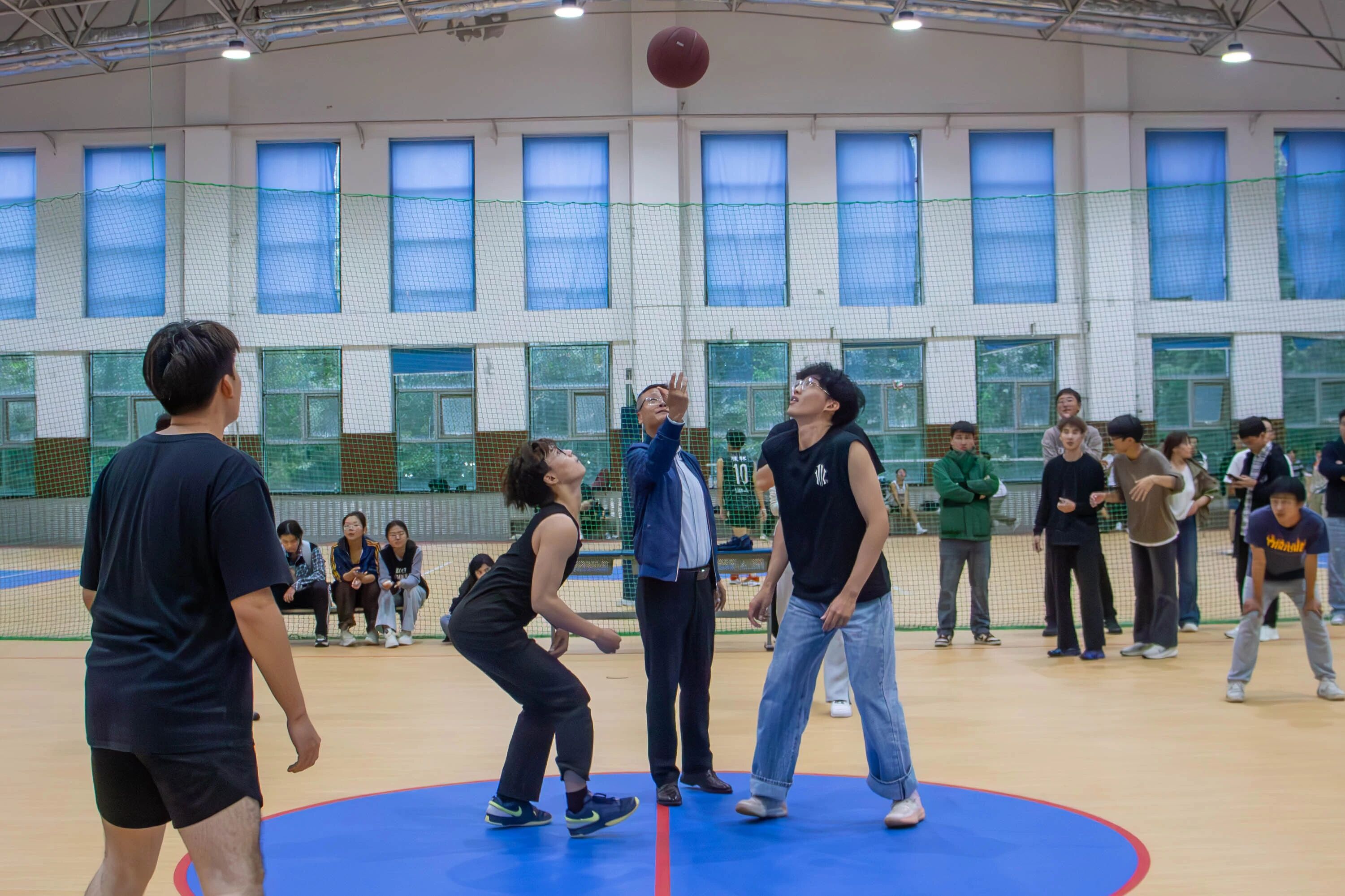 全场目光聚向中线,学院党委副书记邓晗持稳篮球,扬臂将球抛向跳球区,触球瞬间,赛场声响迸发,第二届“智汇杯”新生班级素质联赛之新生篮球赛正式打响。