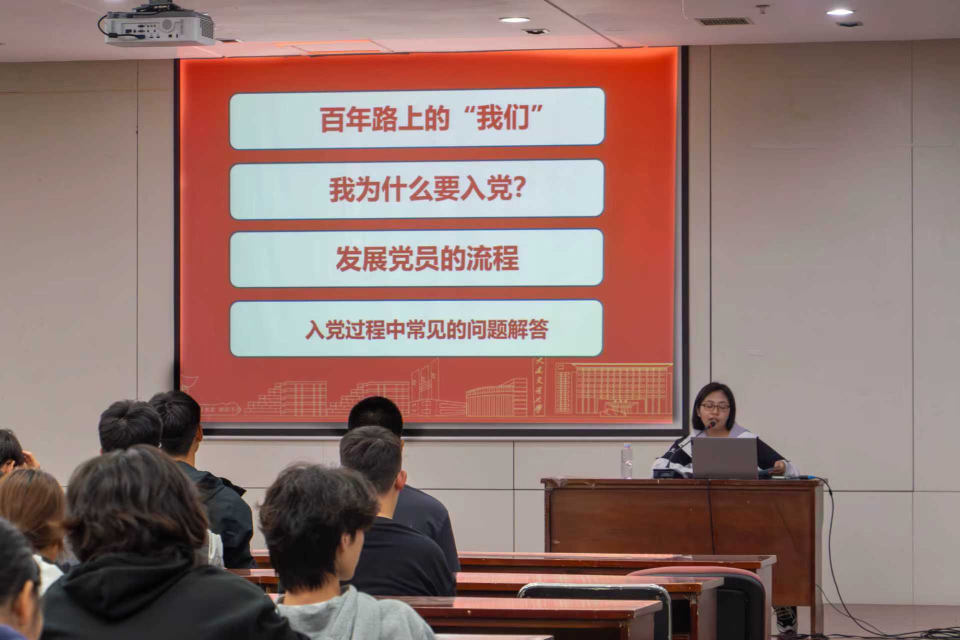 赵金蕾以“筑梦新程 信仰启航”为题,结合校史传承、热门影视隐喻与实践案例,从“百年路上的我们”、“为什么要入党”、“入党的流程”、“入党过程中常见的问题解答”四个方面,为全体2025级新生带来一场兼具思想深度与青春温度的启蒙课。
